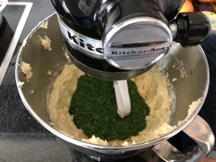 Now you have two options to prepare the gnocchi: either you use two tablespoons and form the gnocchi (scrape from one spoon to the next until you have a oval shape) that way and let “drop” into the hot water (that’s what we did) or you spread flour on a surface, roll out half of the dough and cut thicker “gnocchi slices” to then put into the hot water. Then do the same with the rest of the dough.
