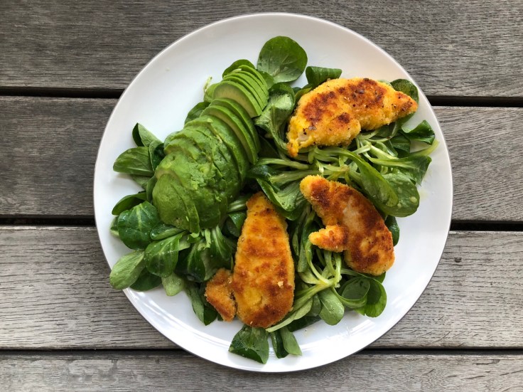 Shortly I was on a trip, coming home and at the airport I stumbled over a salad with chicken nuggets. Instantly I had a major craving for this, but – typical airport – they priced the salad super high and I just thought to myself: Oh well, then I know what’s on my menu the next week! And here we are! And I wanted to make a slightly different version of the chicken nuggets and prepared them with oatmeal-breading instead or “normal” breading. Well actually I did both! Haha!Ingredients for 2