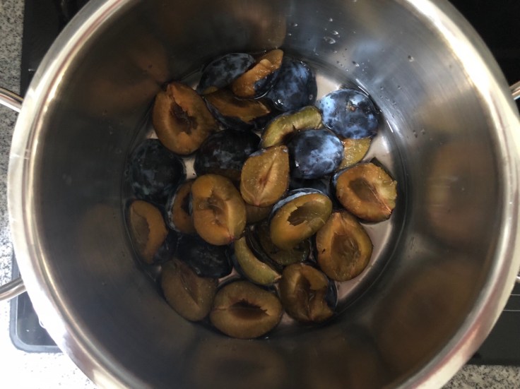 Meanwhile, wash the plums, halve them and remove the pits, place in a pot with 1 glass of water. Heat until the water boils, add the sugar and then reduce heat and let simmer for approx. 10-15 minutes.