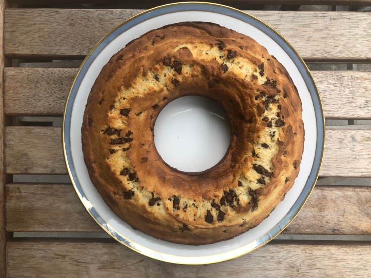 Pour the batter into the baking tin and place in the oven for 20-30 minutes. Just use a wooden skewer to check if the cake is ready – if still doughy, leave in for another bit, if the skewer is dry, its ready. Remove from the oven and let cool. Then you can serve on a large plate. Enjoy!