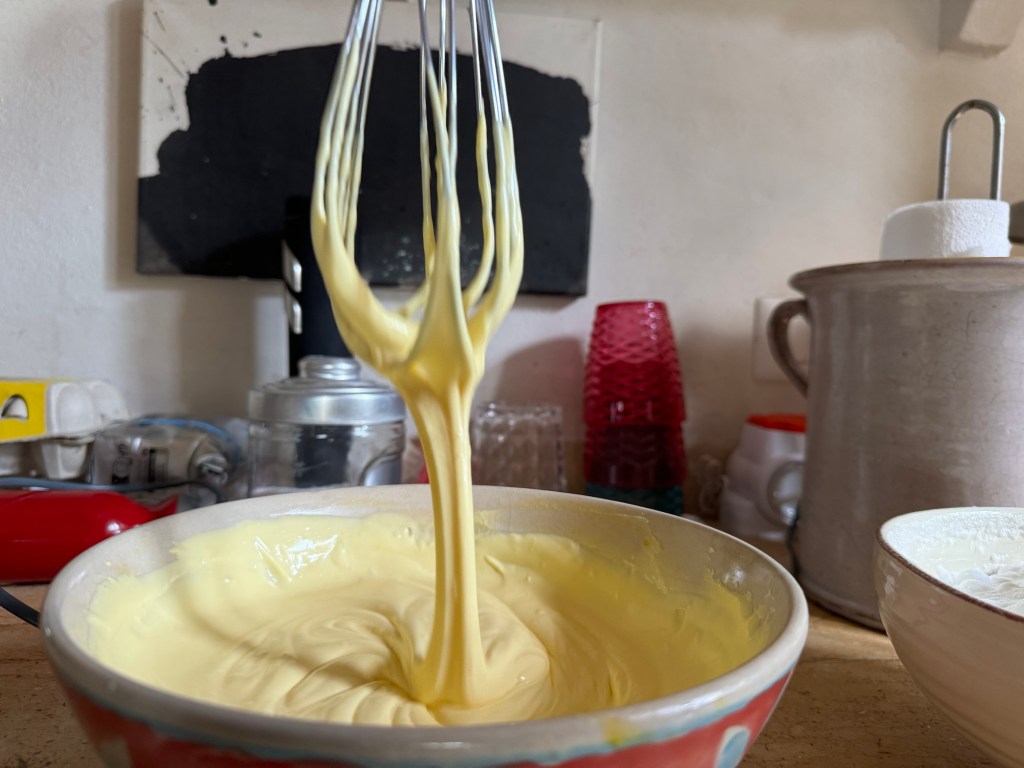 Add one heaped tablespoon of sugar into the egg yolks and a teaspoon of Cointreau and add the mascarpone spoon by spoon and mix. At the end it needs to be liquidy and light yellow