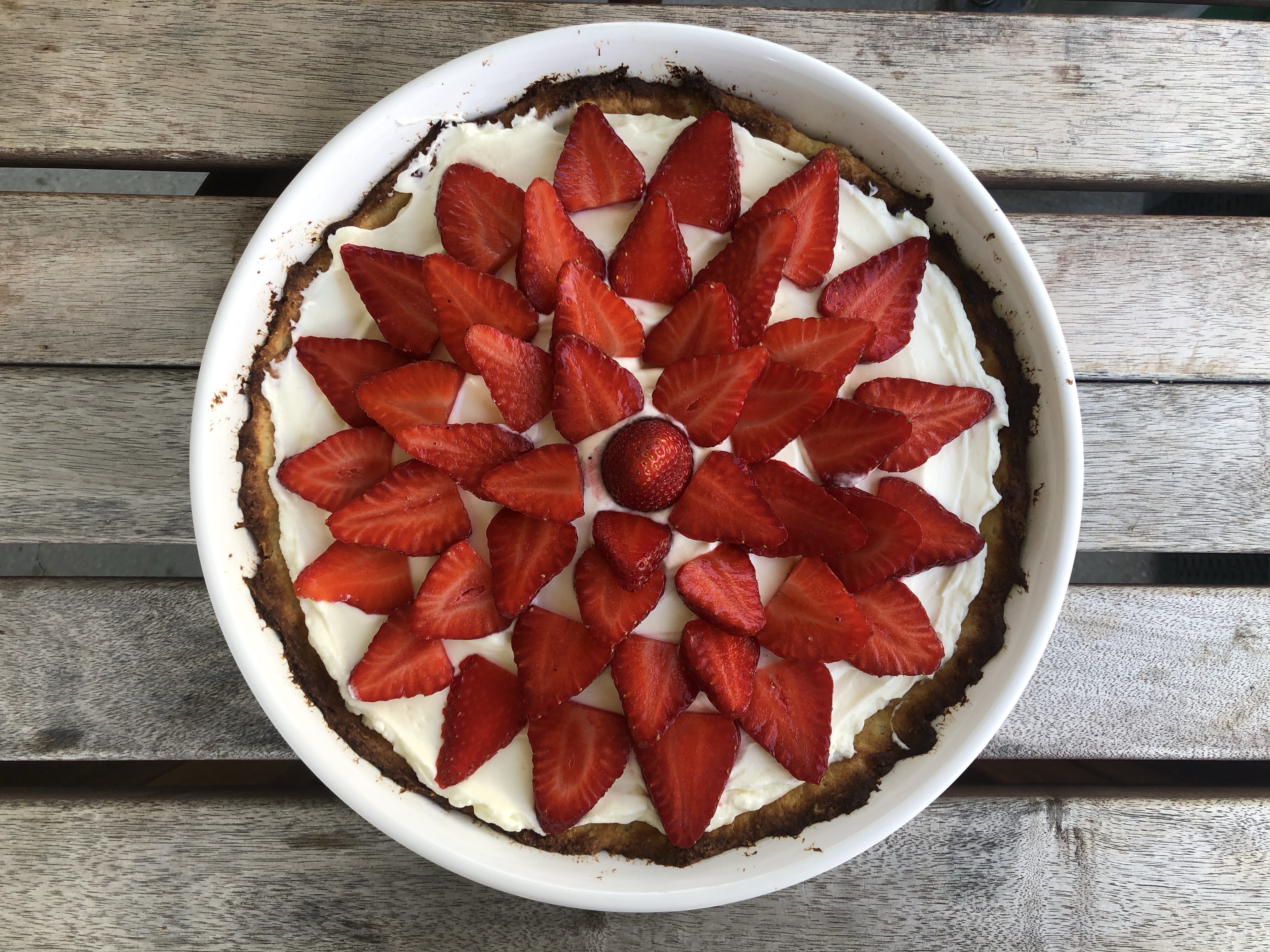 The strawberry season is here and I love it! Every year I can’t wait until it starts and this delicious tart is an ideal addition for this special berry-season. Simple to make, you just need a little time to prepare the tart bottom and let it cool after having been in the oven.