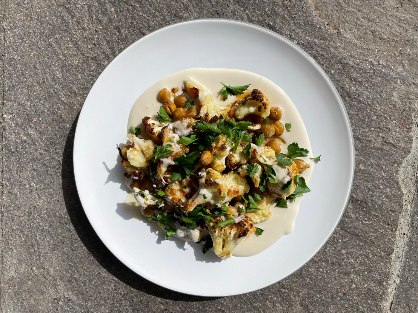 Oven Cauliflower & Chickpeas with Tahini-Lemon dressing